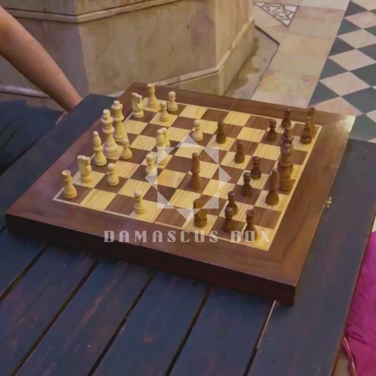 Die Außenseite zeigt ein klassisches Schachbrett, während das Innere ein Damaszener Mosaik mit Perlmutt-Intarsien offenbart – ein Symbol syrischer Kunst und Tradition.