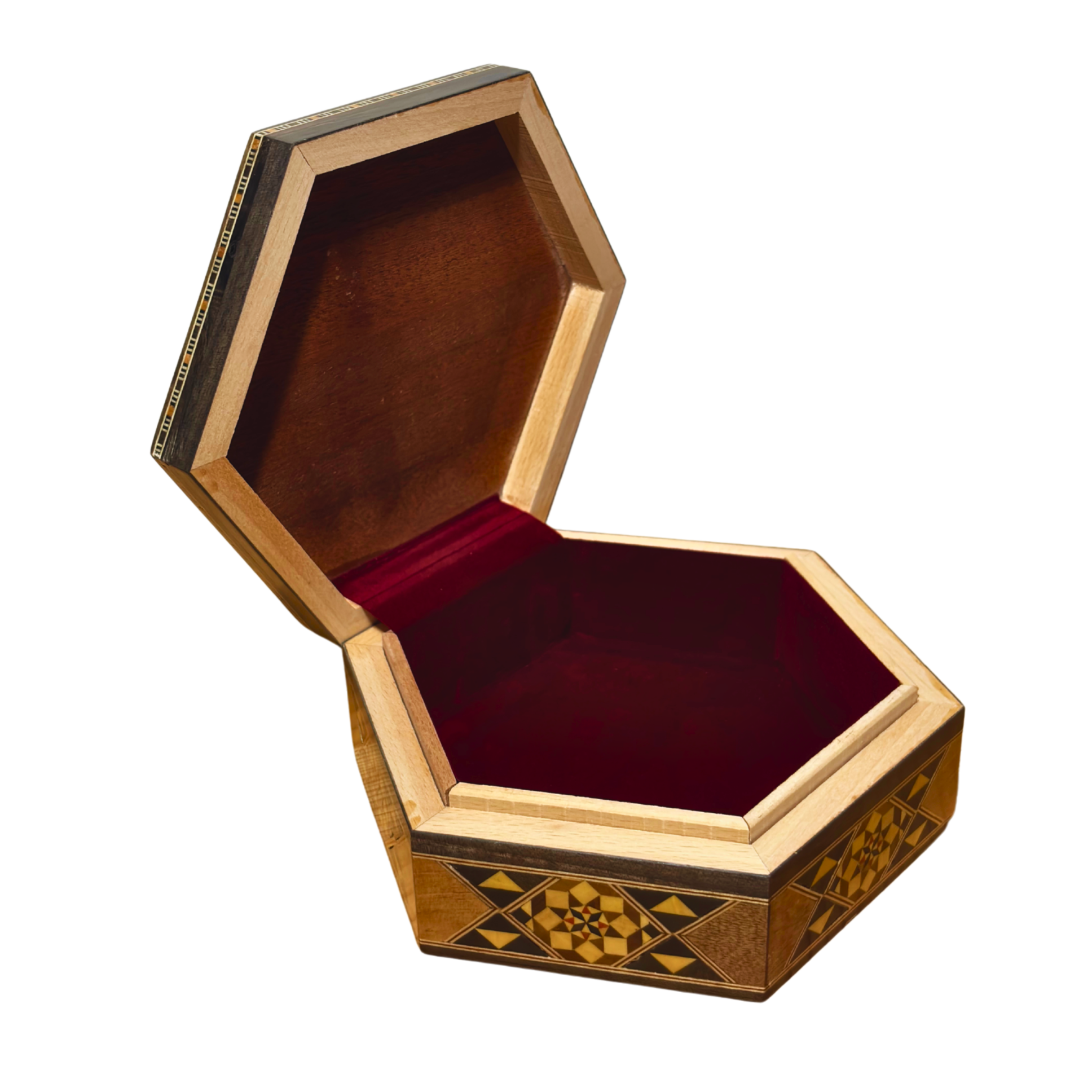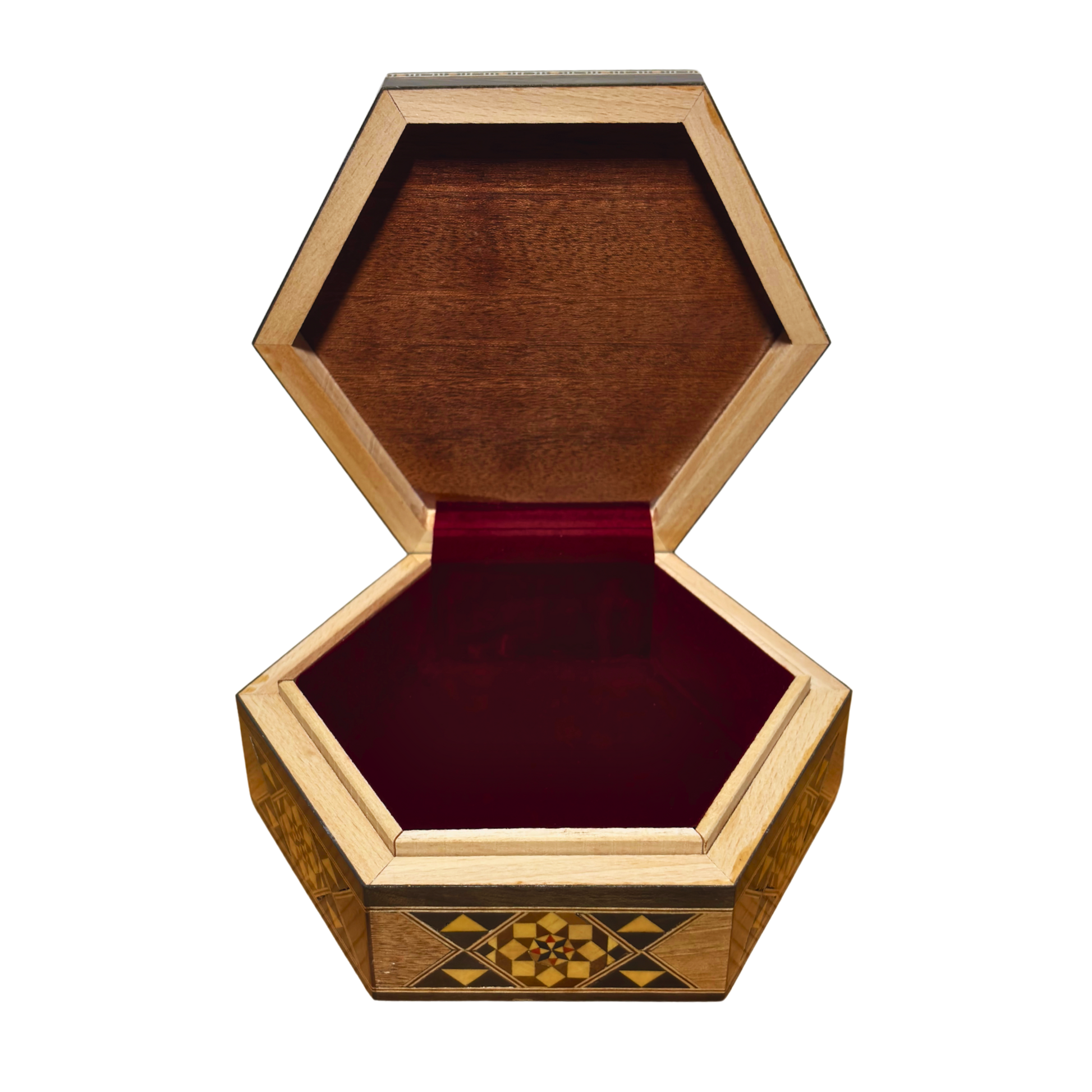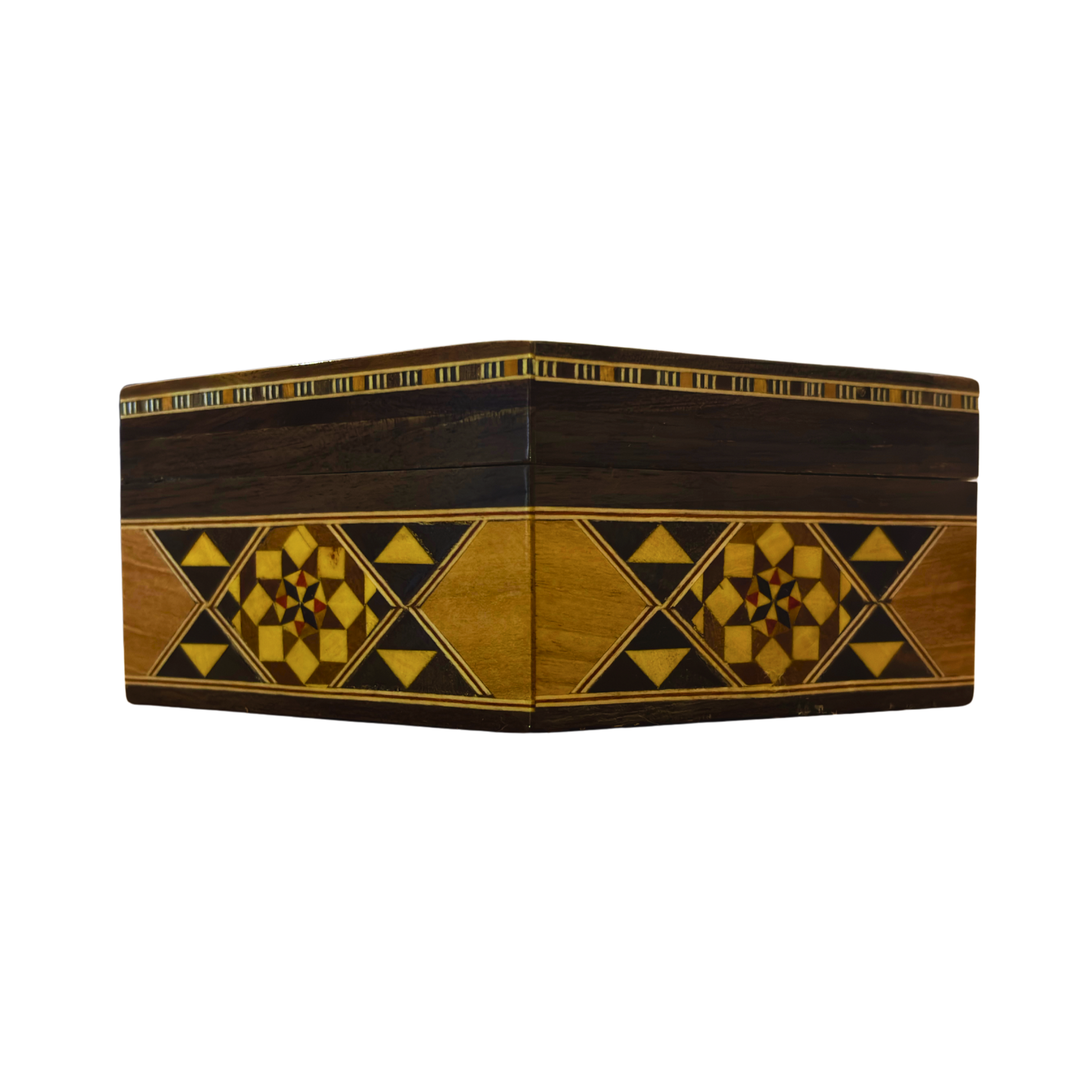 Esta caja de mosaico damasceno combina precisión artesanal, maderas naturales y un diseño elegante. Elaborada con nogal, haya, madera de rosa y madera de limón, y decorada con incrustaciones auténticas de nácar, es una pieza que refleja herencia y refinamiento.