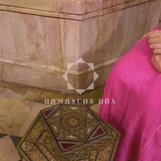 Questa scatola damaschina a mosaico è un’opera del celebre Gaby Al Dayeh, maestro artigiano di 90 anni considerato un simbolo vivente dell’arte del mosaico siriano.