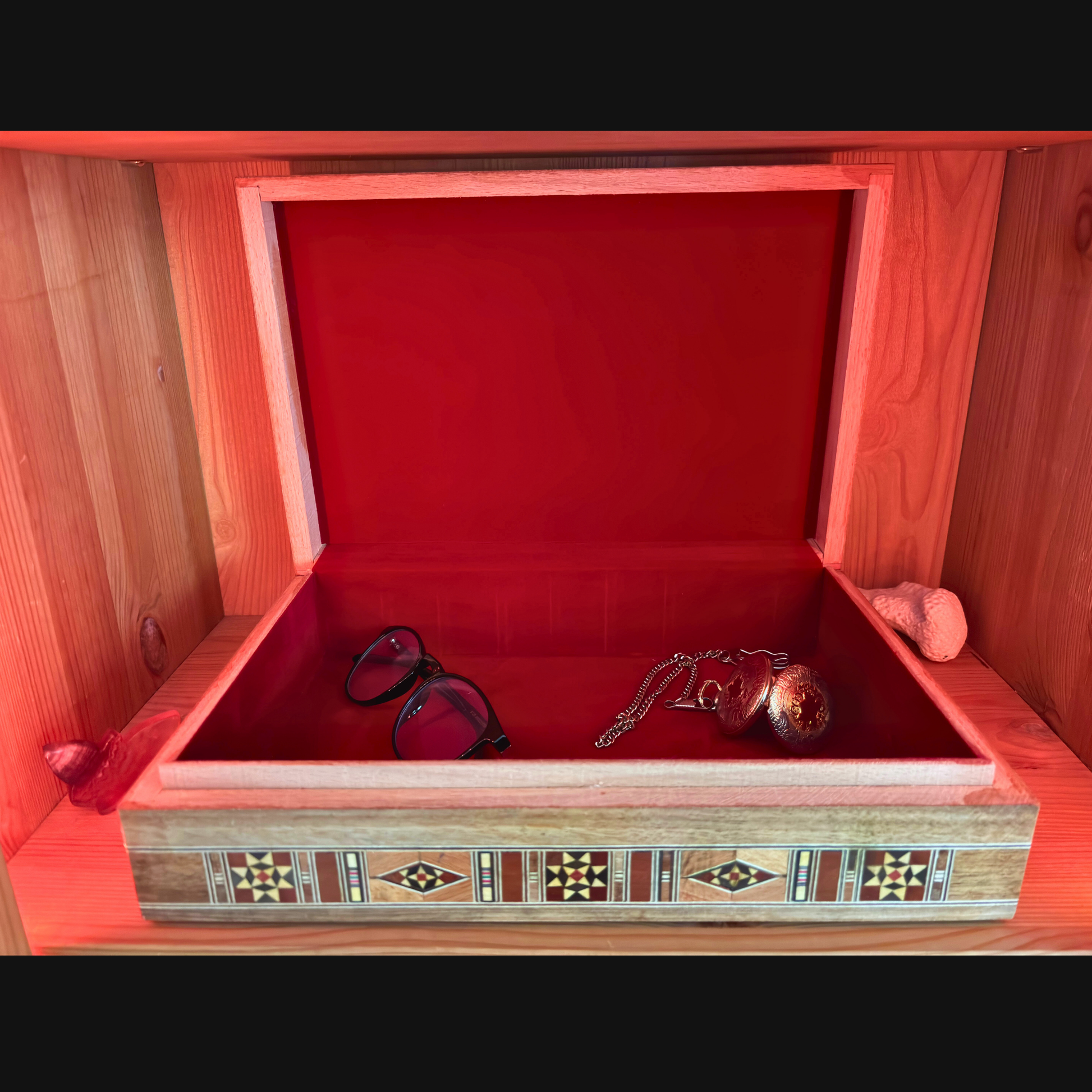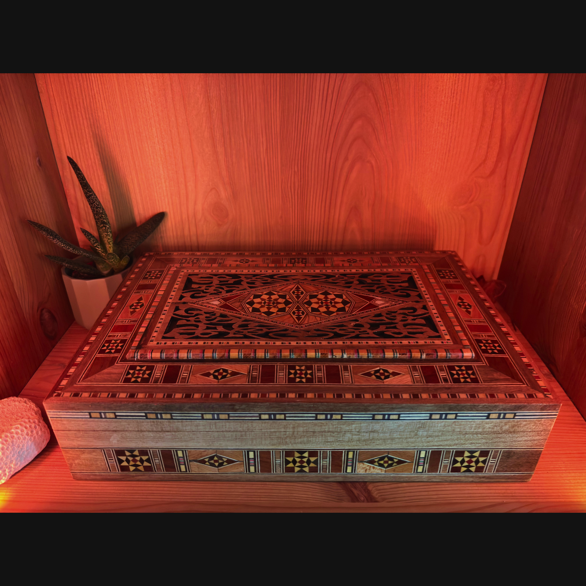 Ervaar de elegantie van traditionele Damascus ambacht met deze grote rechthoekige mozaïekdoos, nauwkeurig met de hand gemaakt van premium beukenhout. Ontworpen voor liefhebbers van verfijnde kunst en tijdloos design, is deze doos perfect voor het veilig bewaren van sieraden, horloges, sigaren, delicate aandenkens of kostbare herinneringen.