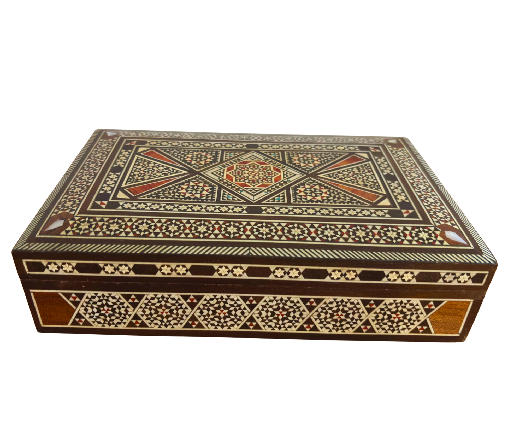 vintage damasceense mozaïekdoos, handgemaakte sieradendoos, houten doos met parelmoer, Syrische mozaïekkist, oriëntaalse inlegdoos, jaren 70 vintage decor, cadeau voor haar, uniek jubileumcadeau, handgemaakt Midden-Oosters kunstwerk, houten schatkist, Damaskus doos, Syrische doos, cadeau voor hem