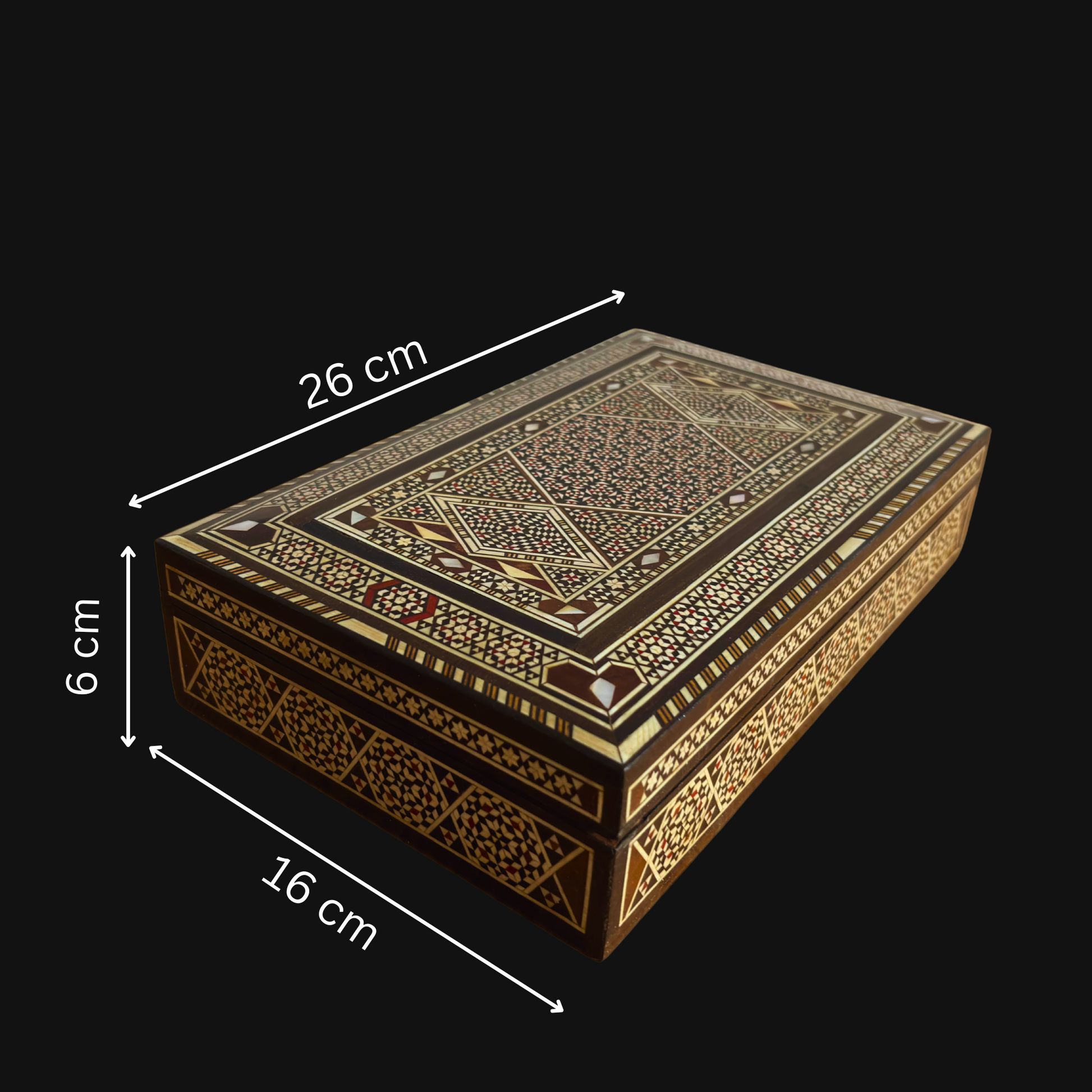 Deze vintage, handgemaakte Damascene mozaïekdoos uit 1970 is een tijdloze schat voor verzamelaars en liefhebbers van verfijnd vakmanschap. Elegant ingelegd met echte moeder van parel en versierd met geometrische patronen geïnspireerd op traditionele Syrische kunst. Vervaardigd uit hoogwaardig walnoot-, beuken-, citroen- en gele dennenhout, combineert deze houten sieradendoos erfgoed met tijdloze schoonheid.