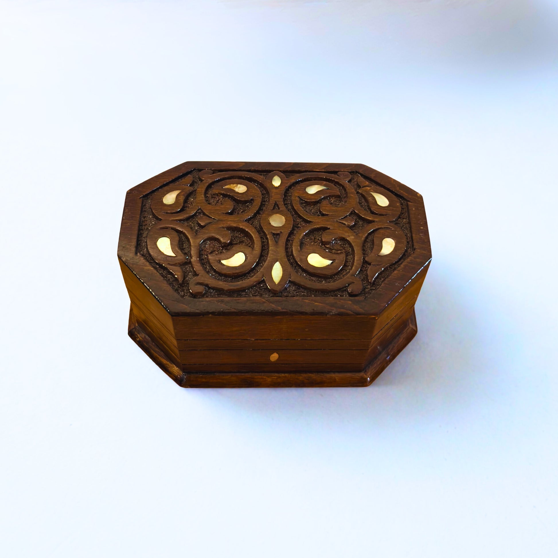 Ręcznie Rzeźbione Pudełko z Buku – Masa Perłowa i Wykończenie Orzechowe