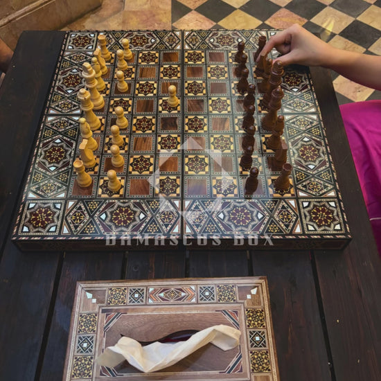 wooden chess pieces, classic chess set, elegant chessmen, Damascus Box accessories, luxury board game, oriental chess design, refined game set, wood chess pieces, gift for him, gift for her