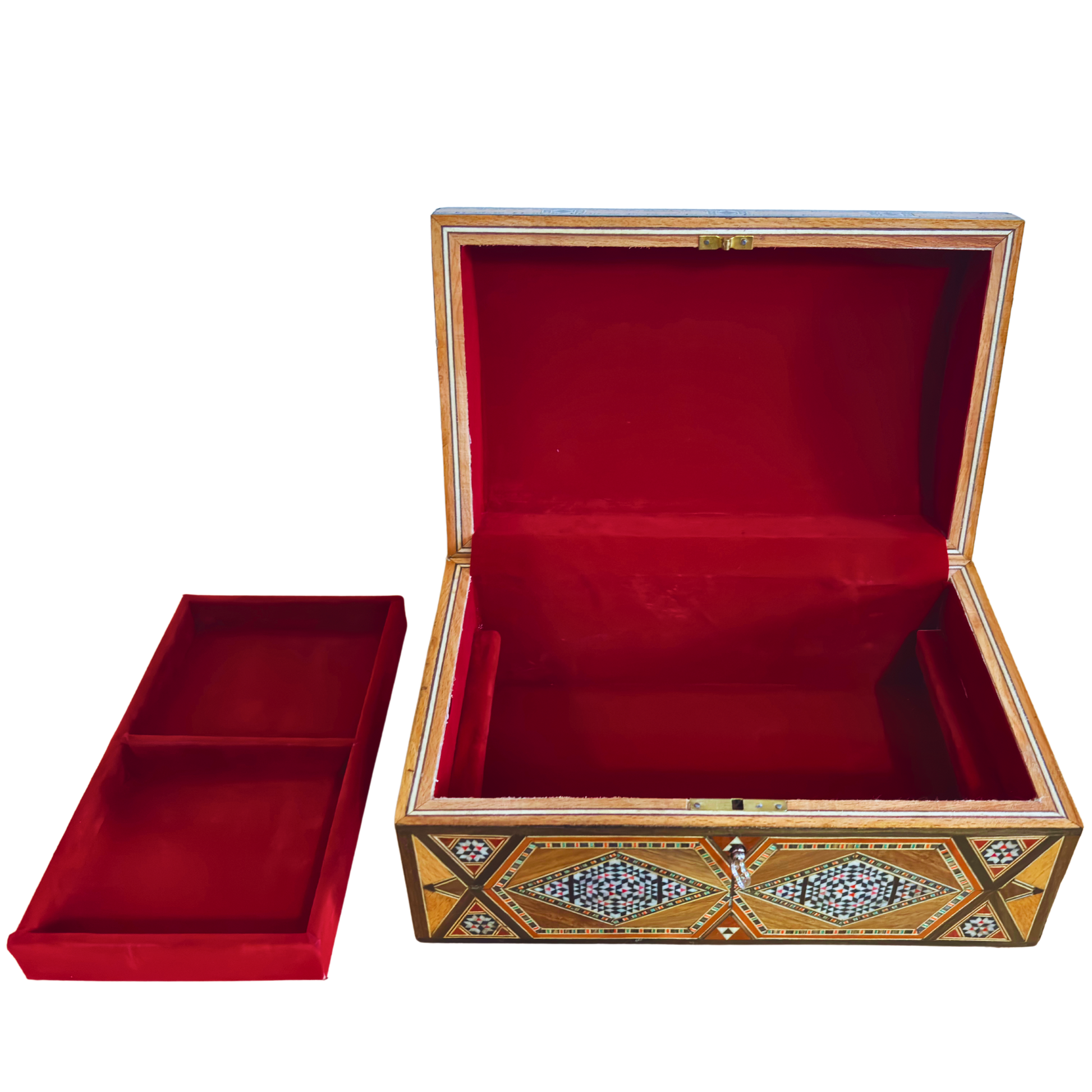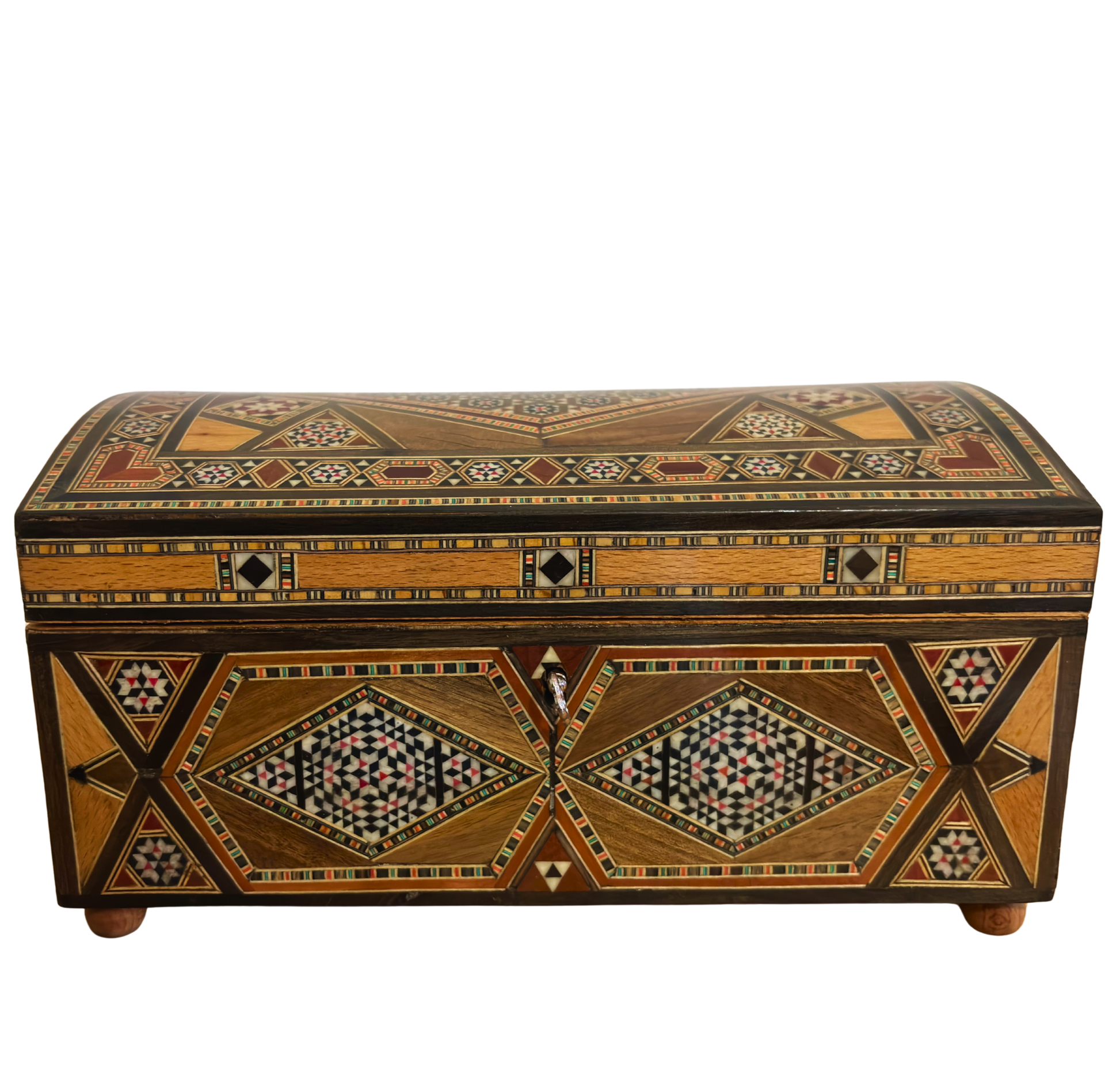 large multilevel jewelry box, vintage Damascene mosaic box, 1970s jewelry box with lock, handcrafted wooden keepsake, mother of pearl inlay box, eucalyptus wood jewelry chest, rosewood vintage box, luxury vintage storage box, unique gift for her, artisanal gift for special occasions, elegant jewelry organizer, handcrafted Damascus box, Syrian mosaic box, vintage gift for her, Damascus box, gift for him