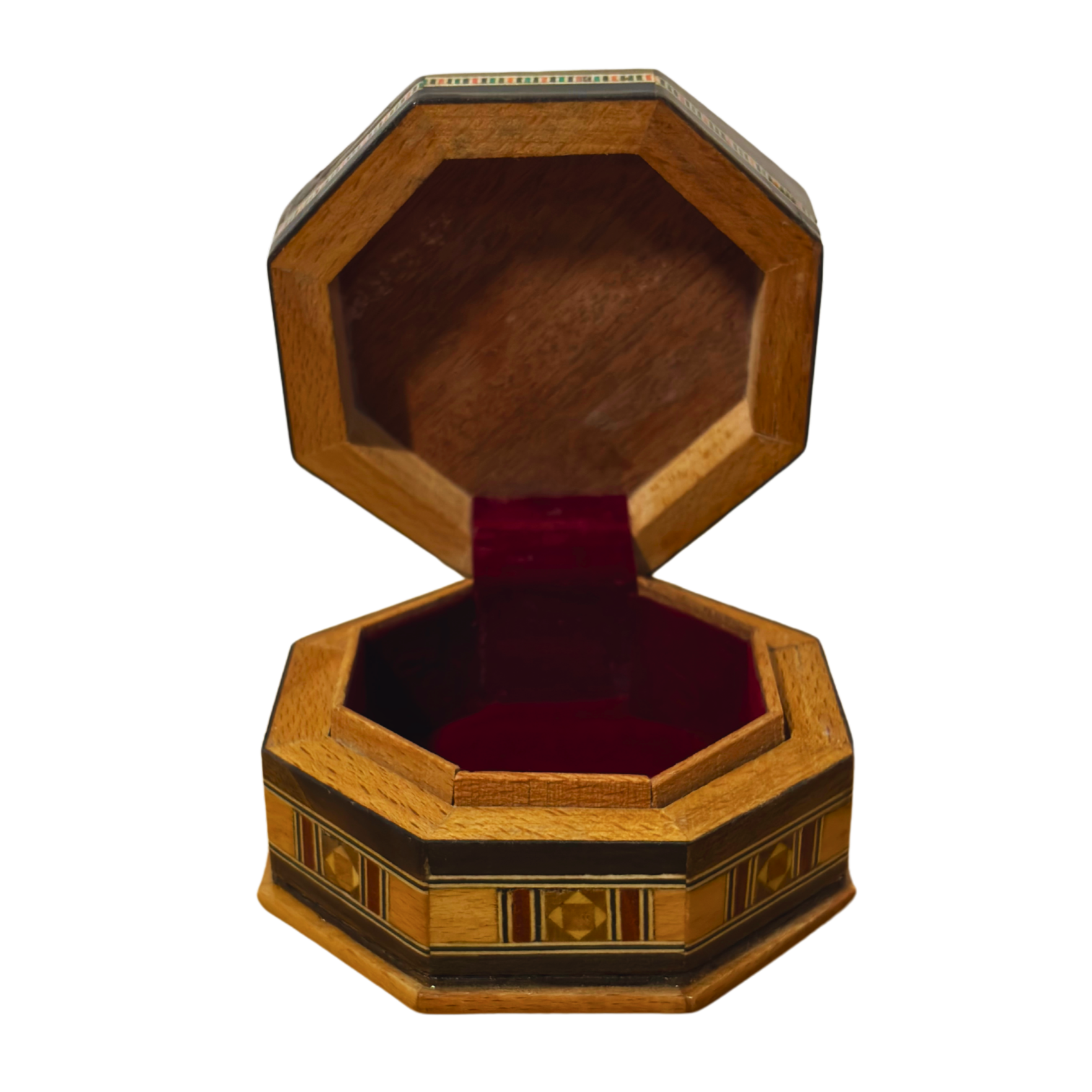 Crafted from a rich blend of beechwood, walnut, rosewood, lemon wood, and eucalyptus, the octagonal form enhances the rhythm and balance of the mosaic design. The interior is lined with luxurious wine-red velvet, offering elegant protection for jewelry, keepsakes, or small valuables.