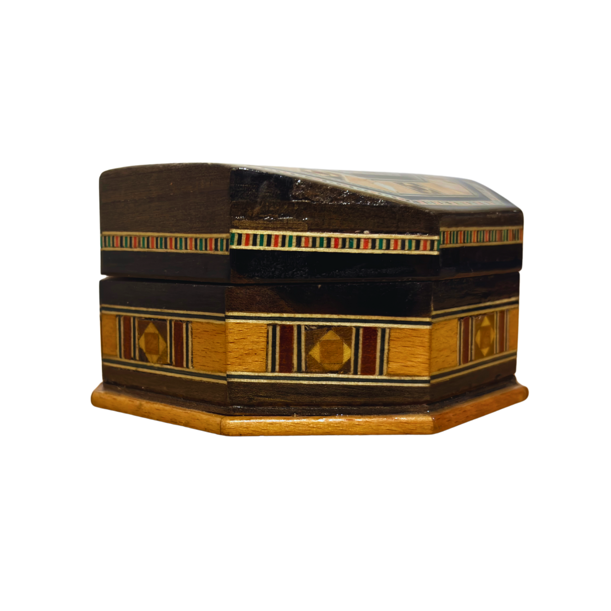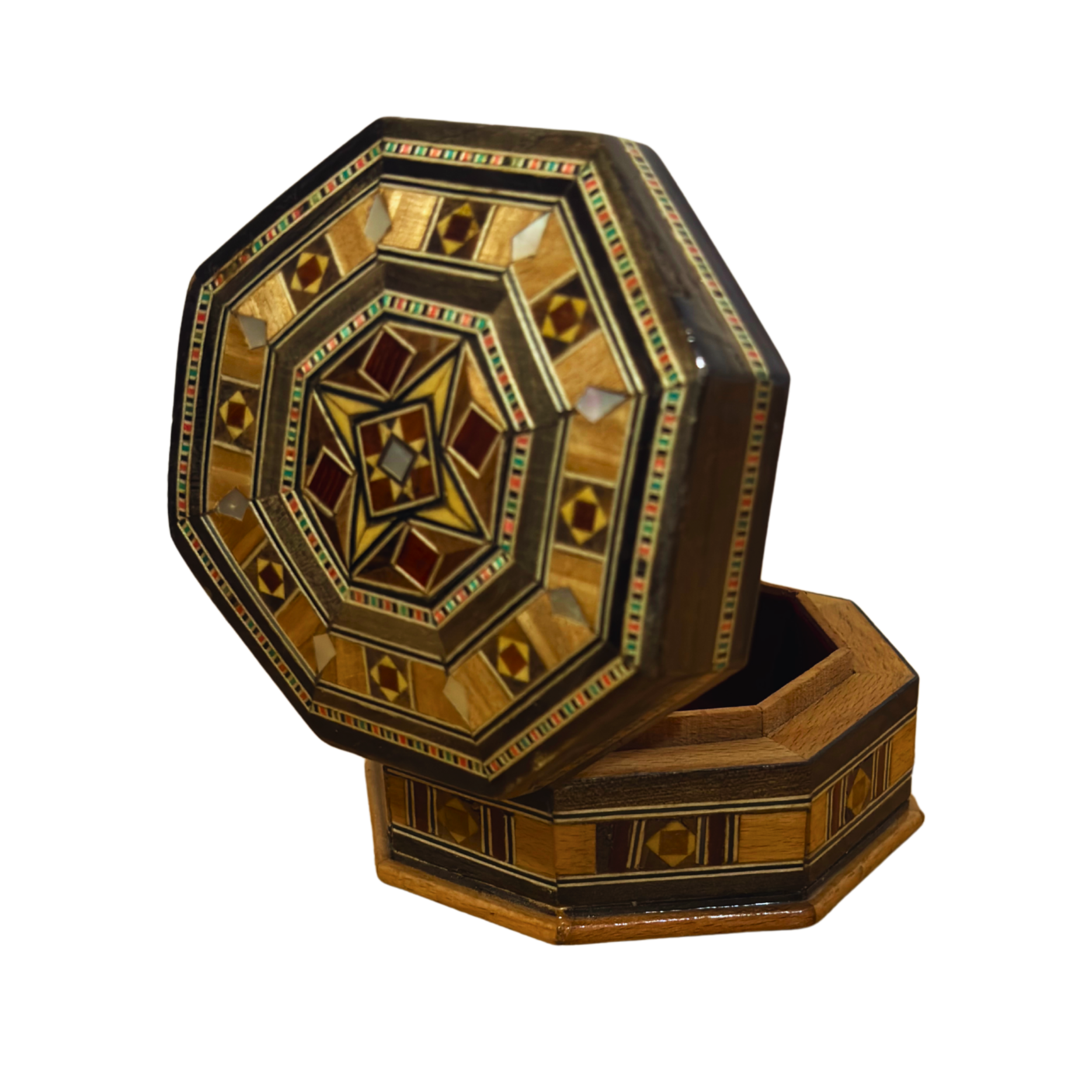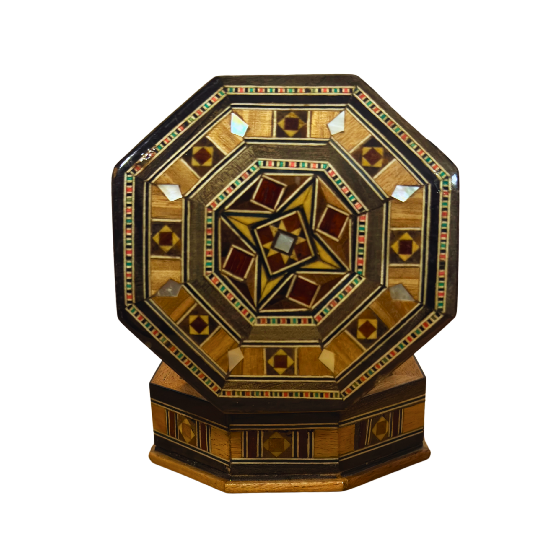 This mosaic box reflects the long-established mosaic tradition of Damascus, admired for its precise geometric patterns and harmonious composition of natural woods. Each piece is meticulously handcrafted, preserving an authentic artisanal heritage.