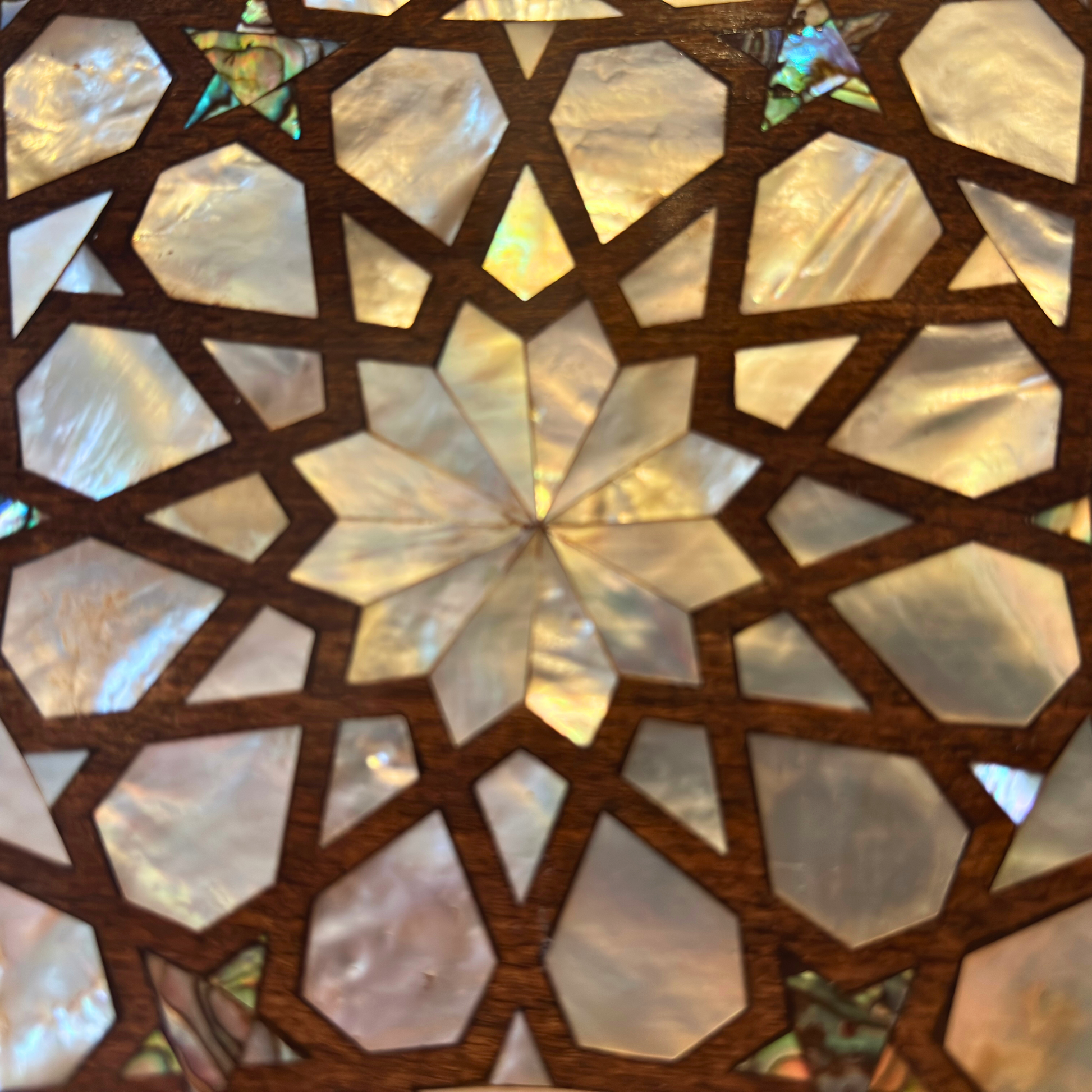 Carved from premium walnut wood and adorned with star-shaped patterns of mother of pearl, this piece captures the elegance of ancient Syrian mosaic design.