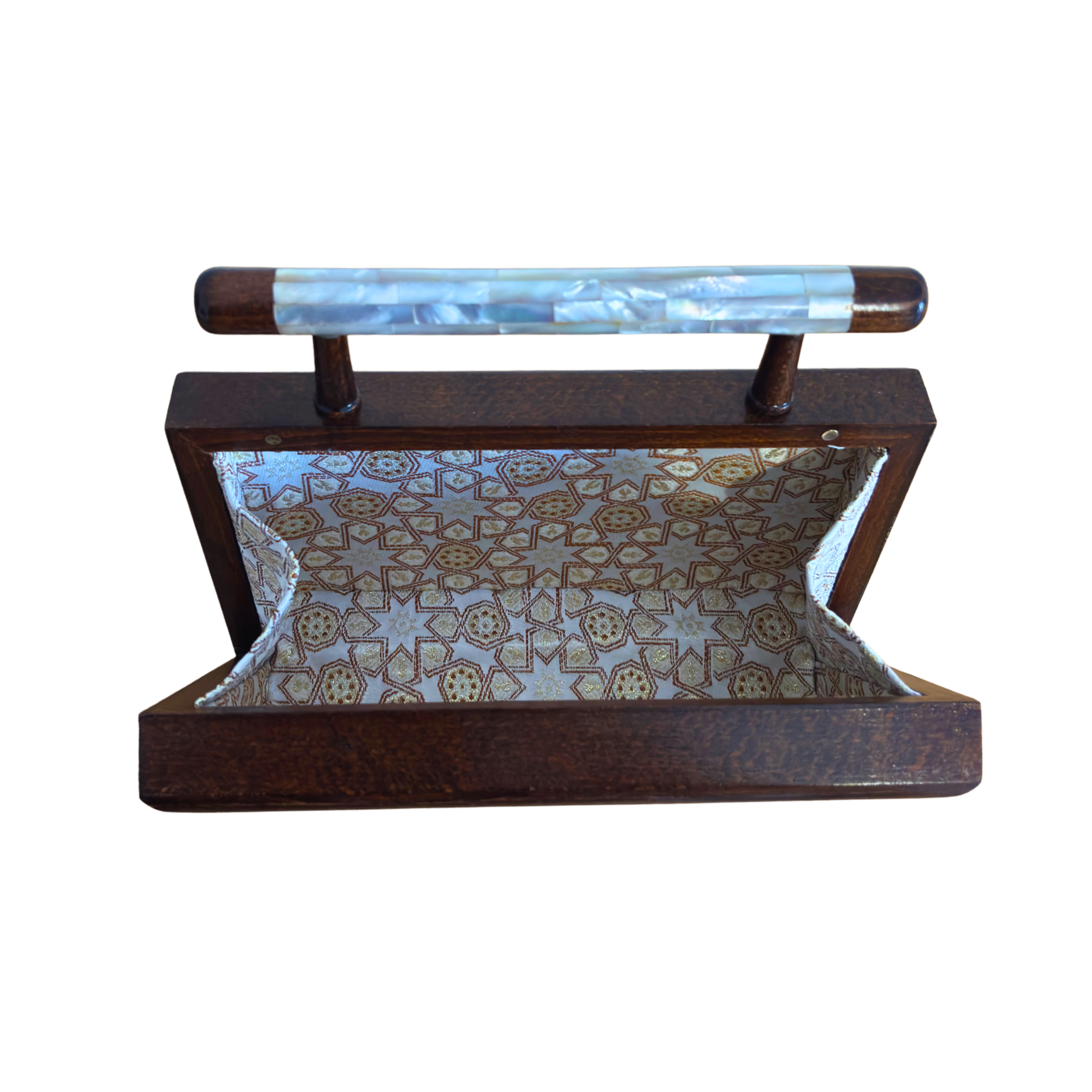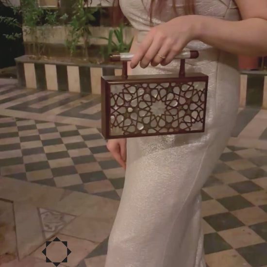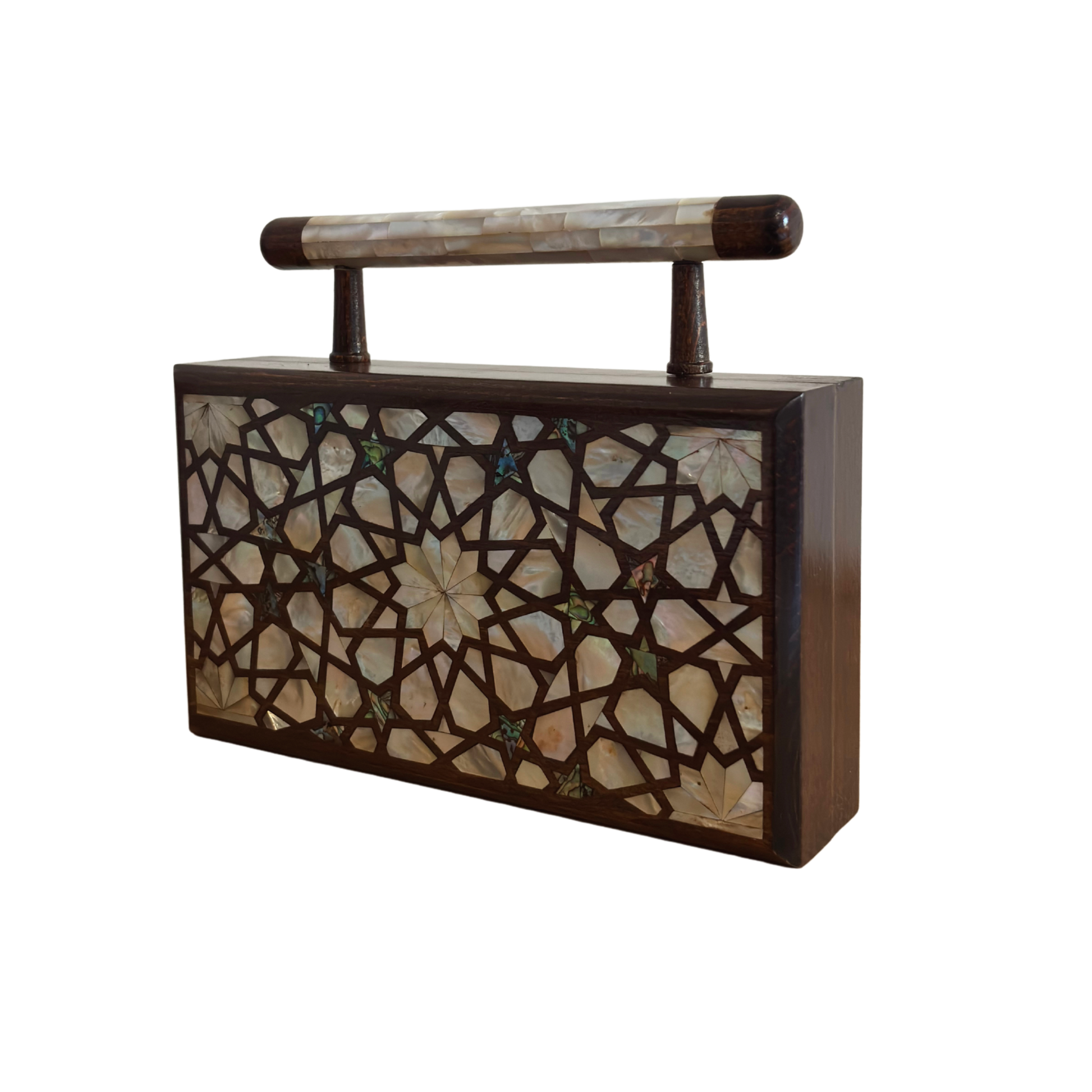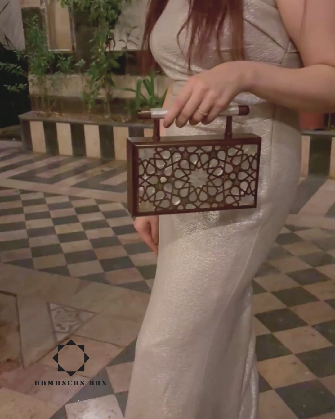 Damascene clutch, mother of pearl inlay, walnut wood handbag, oriental fashion, brocade interior, luxury handcrafted bag, Syrian artistry, Damascus Box