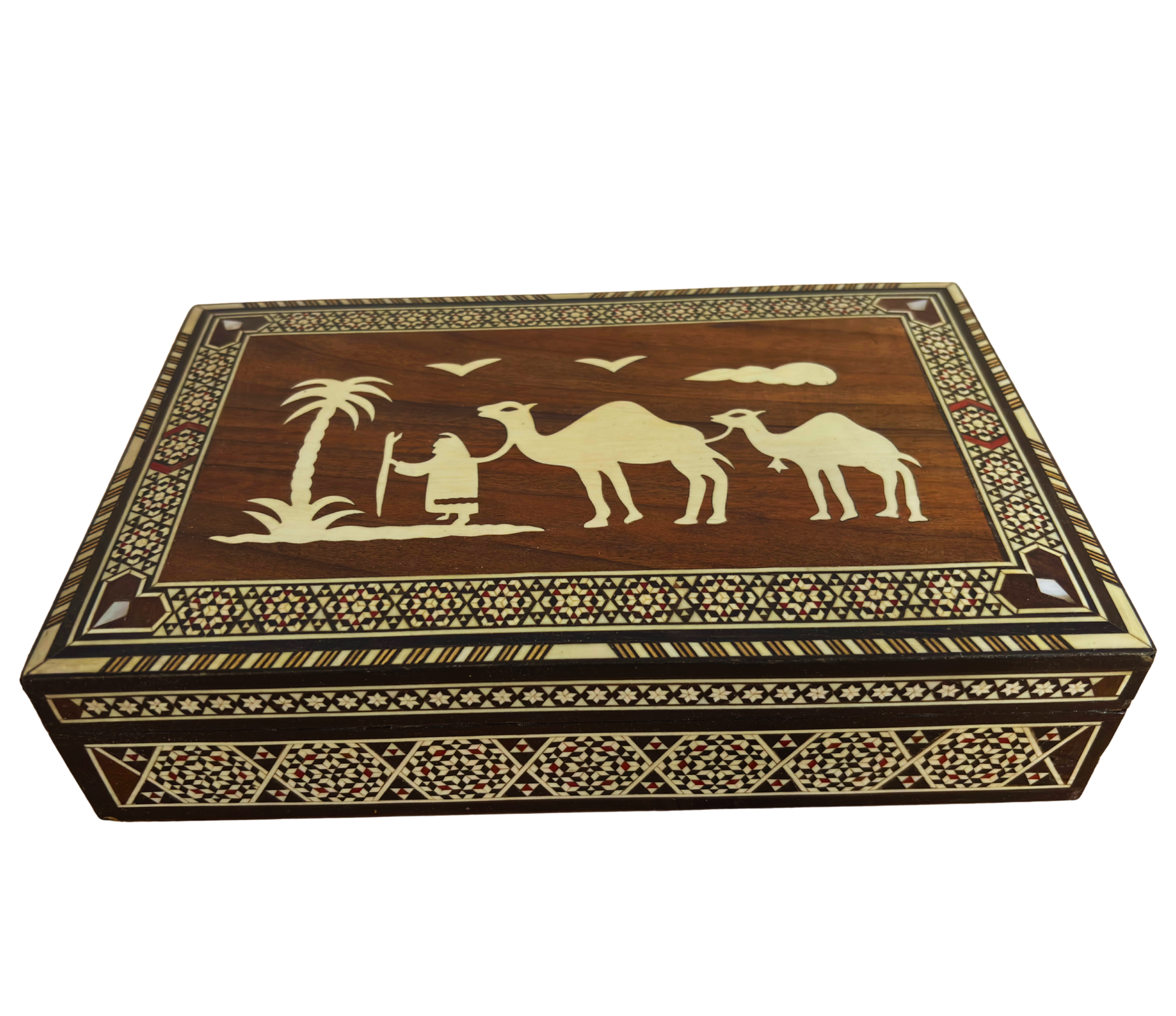 vintage camel mosaic box, handmade Damascene box, mother of pearl jewelry box, Bedouin desert scene box, Syrian mosaic wood box, 1970s vintage gift, Middle Eastern handmade décor, gift for her, oriental jewelry box, desert theme keepsake box, Damascus box, Syrian box, gift for her, gift for him
