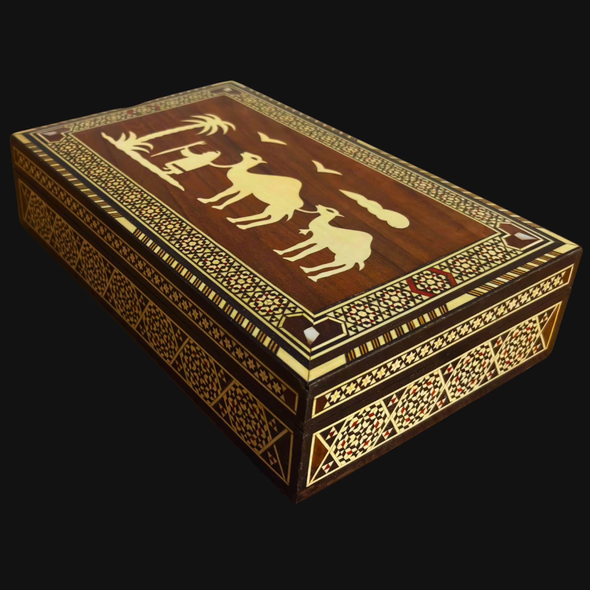 This rare vintage Damascene mosaic box from 1970 is a stunning example of traditional Middle Eastern craftsmanship. The lid beautifully depicts a desert scene featuring two camels, a Bedouin traveler, and a date palm tree—symbols of timeless nomadic life and heritage—elegantly inlaid with genuine mother of pearl. Crafted using premium eucalyptus, rose, beech, walnut, lemon, and yellow pine woods, this box combines warm wood tones with intricate artistry.
