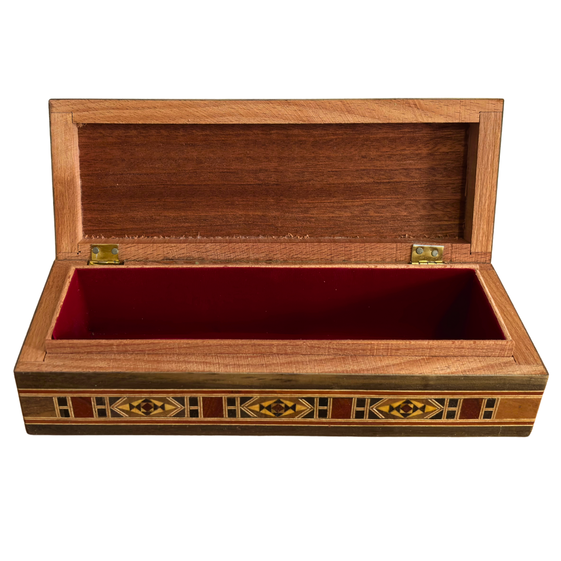 caixa de madeira com mosaico feita à mão, caixa retangular longa com incrustações, caixa de canetas com madrepérola, caixa síria de joias, baú artesanal de madeira, presente elegante feito à mão, decoração geométrica árabe, caixa de arte oriental, caixa artesanal de armazenamento, caixa de Damasco, caixa síria, presente para ela, presente para ele
