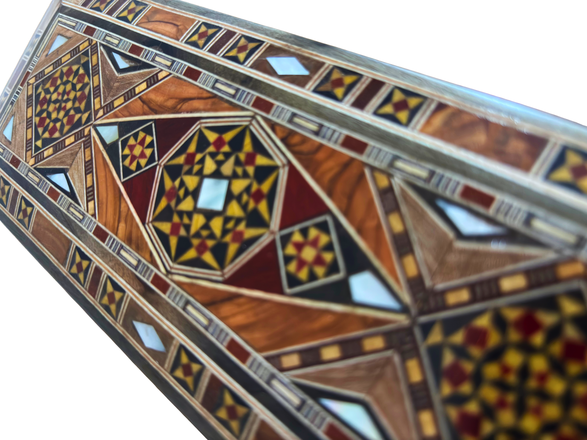 Realce o seu espaço com esta deslumbrante caixa de marchetaria de Damasco feita à mão, lindamente moldada em um formato retangular longo que é ao mesmo tempo prático e artístico. Fabricada com cuidado por artesãos especializados utilizando madeiras de nogueira, faia, limoeiro e pinho amarelo, e incrustada com luminosa madrepérola, esta peça exibe padrões geométricos tradicionais inspirados na arte síria.