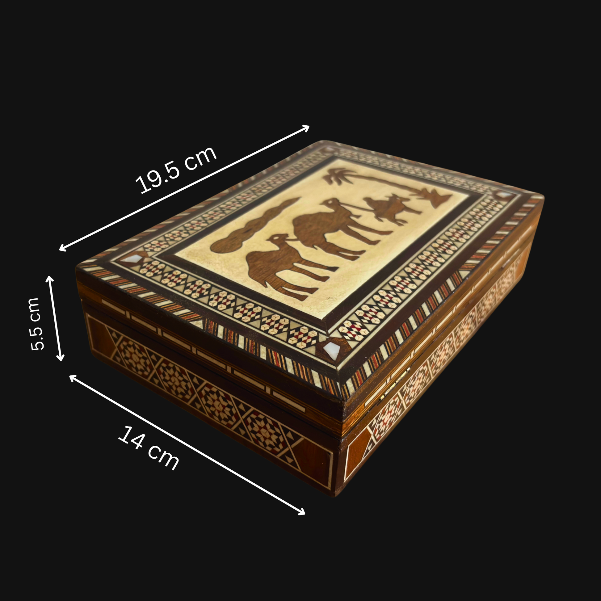 Reviva a beleza do artesanato tradicional com esta caixa damascena vintage de 1970. Fabricada artesanalmente com madeiras de nogueira, faia, limoeiro e pinho amarelo, apresenta uma cena intrincada de dois camelos guiados por um beduíno montado num burro ao lado de uma palmeira – tudo incrustado com brilhante madrepérola.