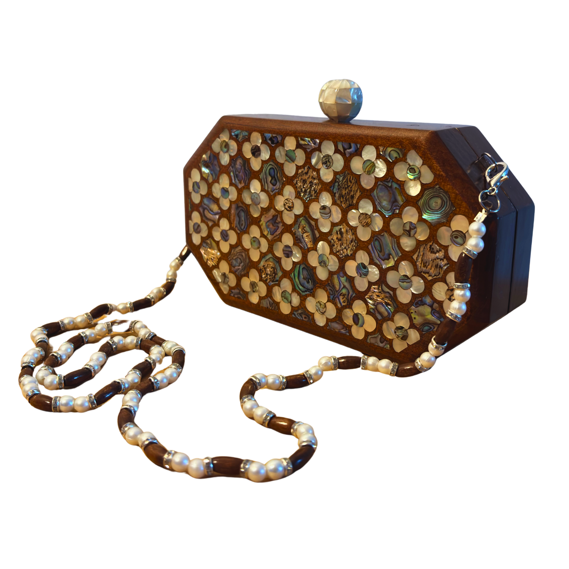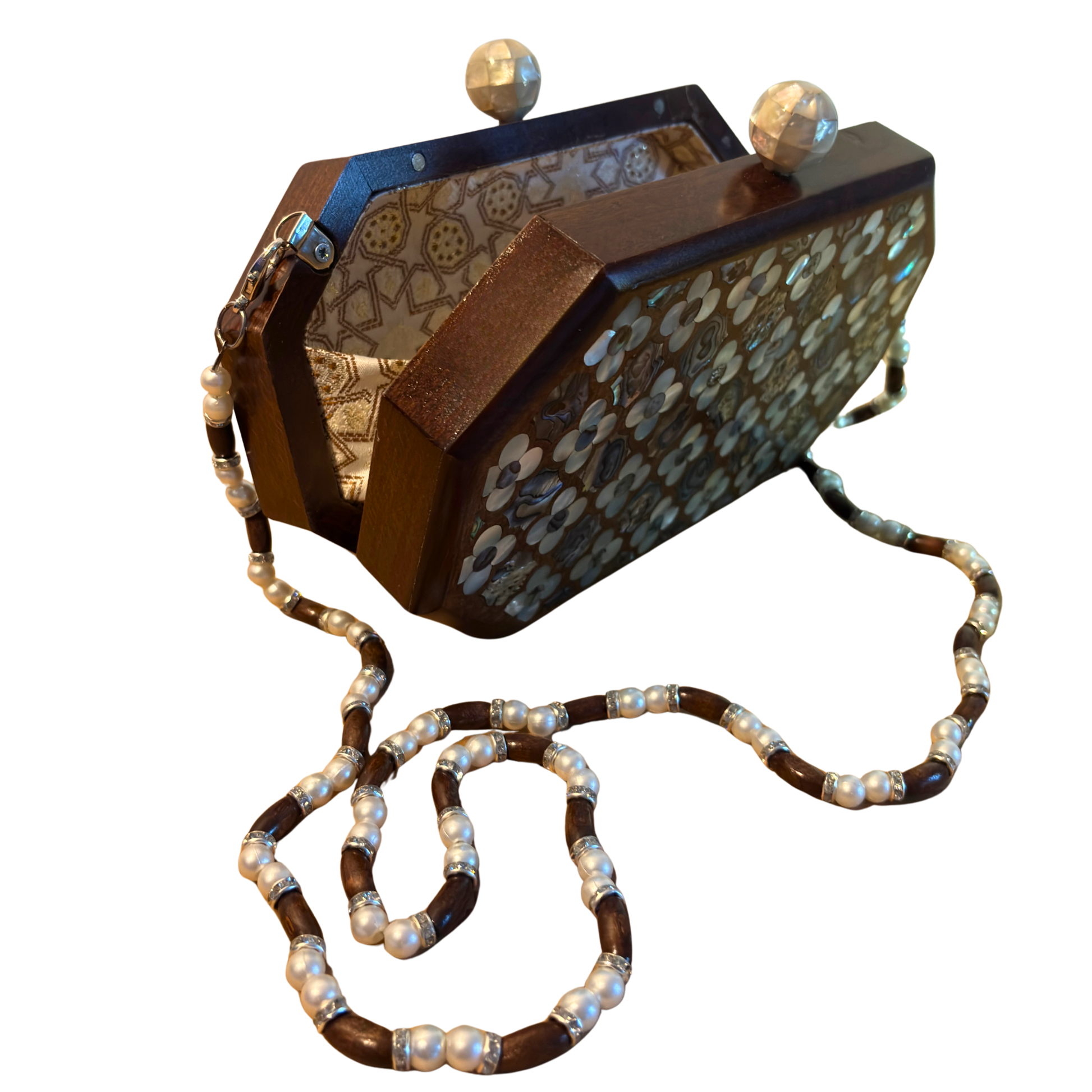 Jouri – Lüks Şam El Çantası, Gül Motifli Sedef İşleme & İnci Tesbih Zinciri