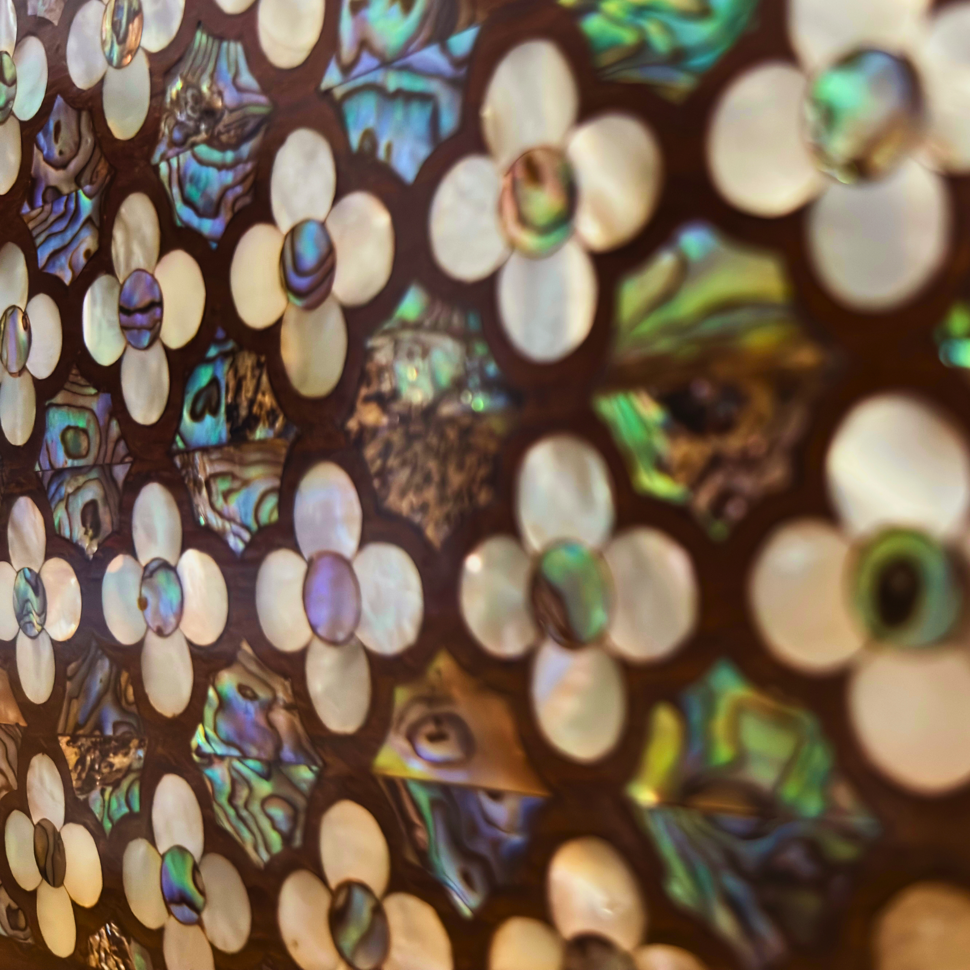 Seçkin ceviz ağacından el işçiliğiyle üretilmiş olup, sedef kakma gül motifleri her hareketle yumuşak bir ışıltı yansıtır — zarafet, usta Şam zanaatının dokunuşuyla.