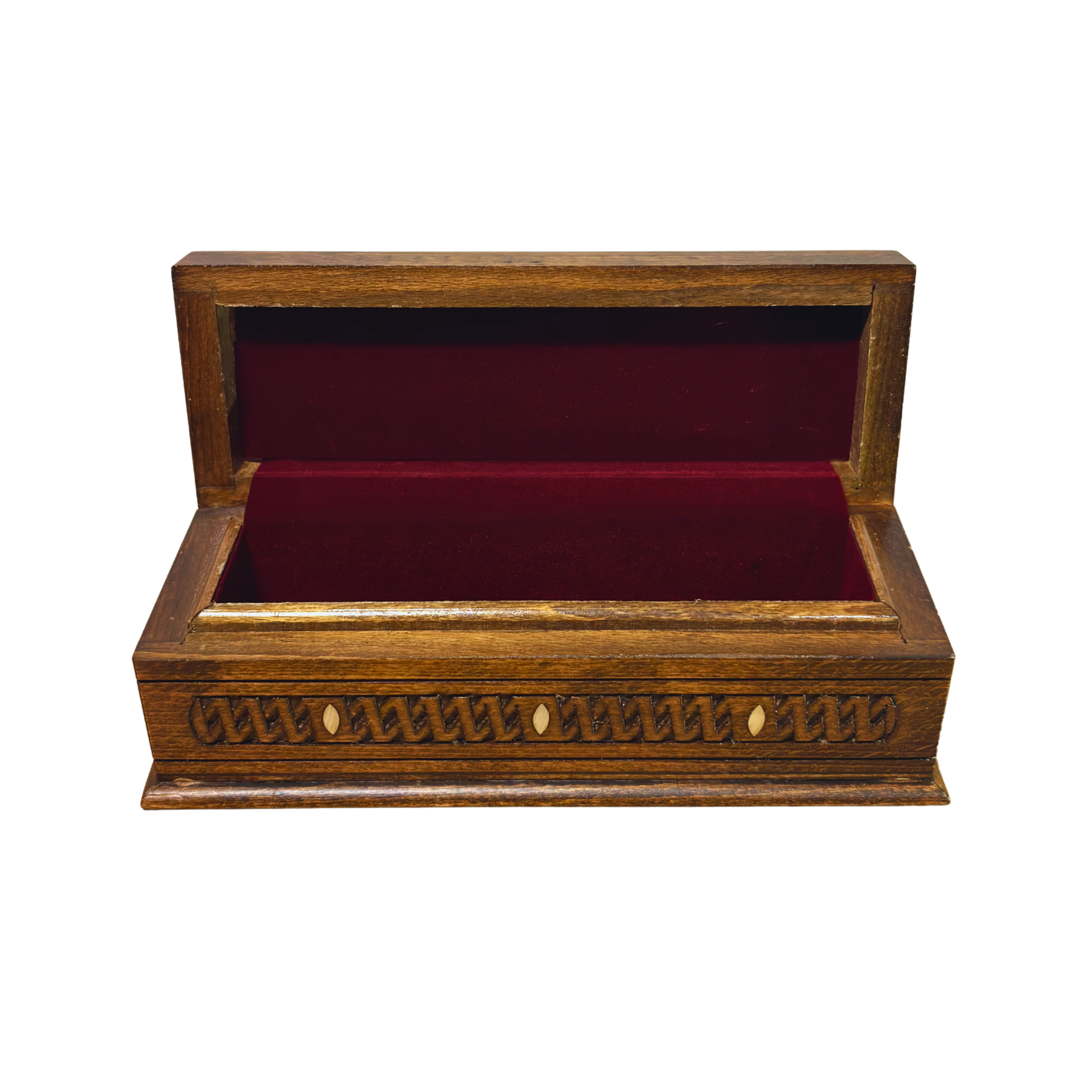 Koyu ceviz kaplama ve bordo kadife iç yüzey, takılar, kalemler veya tespihler için zarif bir saklama alanı sunar.