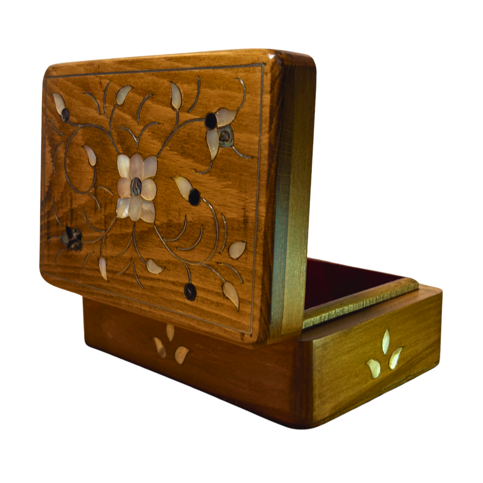 Açık ceviz kaplaması, sedef kakmaları ve bordo kadife iç tasarımı ile ustalığı ve lüks detayları bir araya getirir.