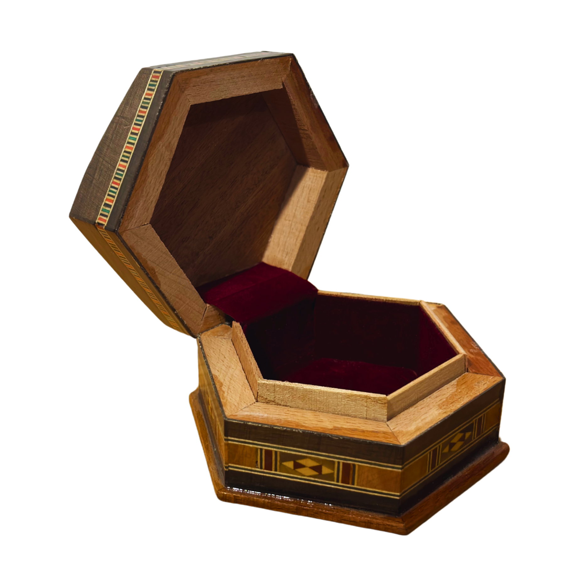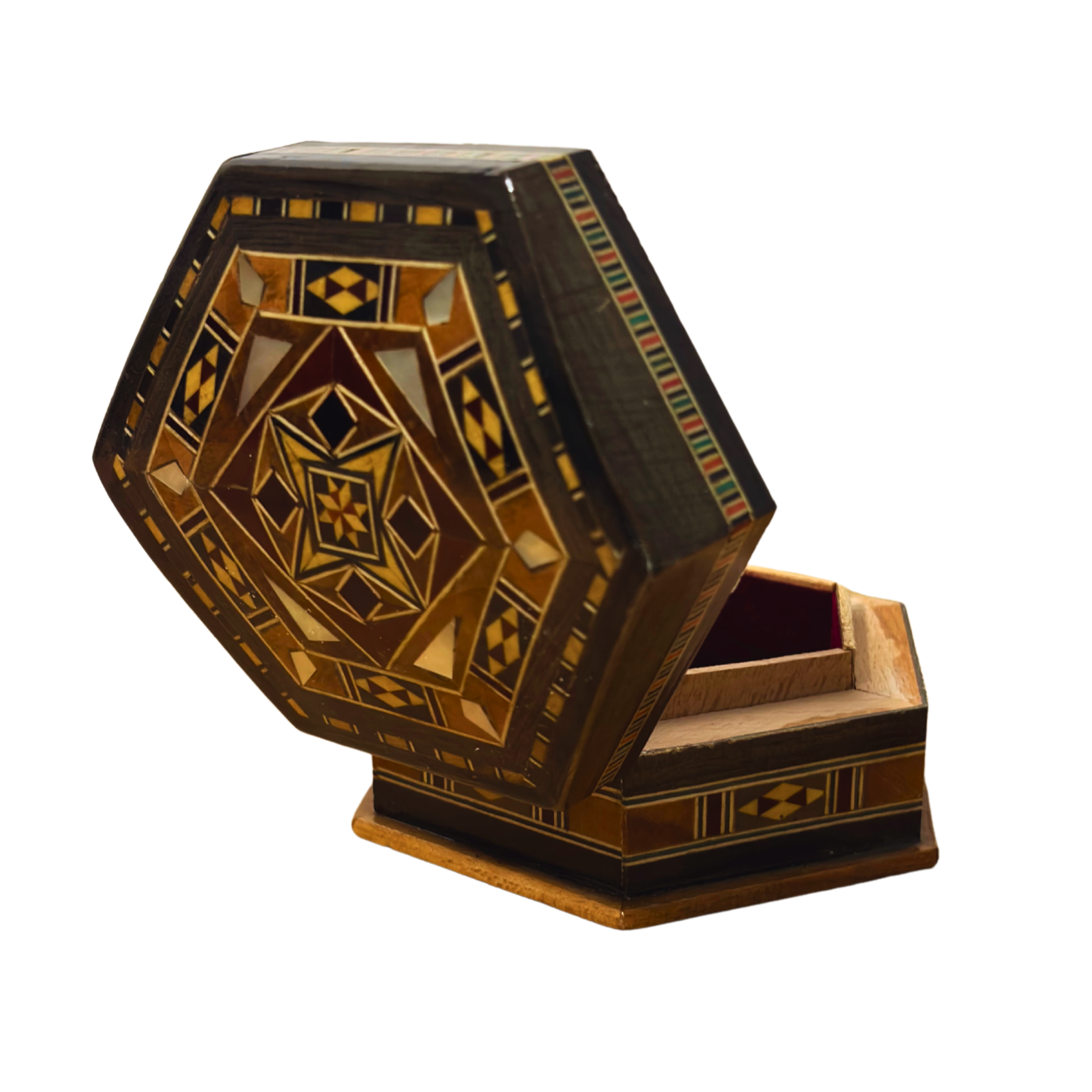 mozaik kutu, şam mozaik sanatı, altıgen ahşap kutu, suriye el işi, el yapımı hediye, Damascus Box